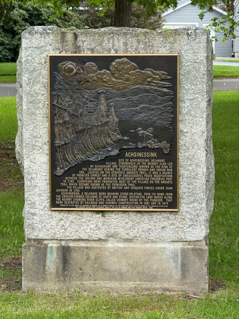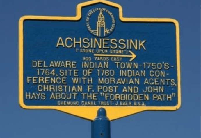 In the 1750s a group of the Susquehanna Delaware people built a village, Achsinessink, on the Chemung River in what today is the City of Corning. The village was destroyed by British and Iroquois forces in 1764; and the only signs of the Delaware people in the city today are the historical marker, located in front of the Corning Y.M.C.A. and the Achsinessink Monument which is in the Achsinessink Park in the Houghton Plot.